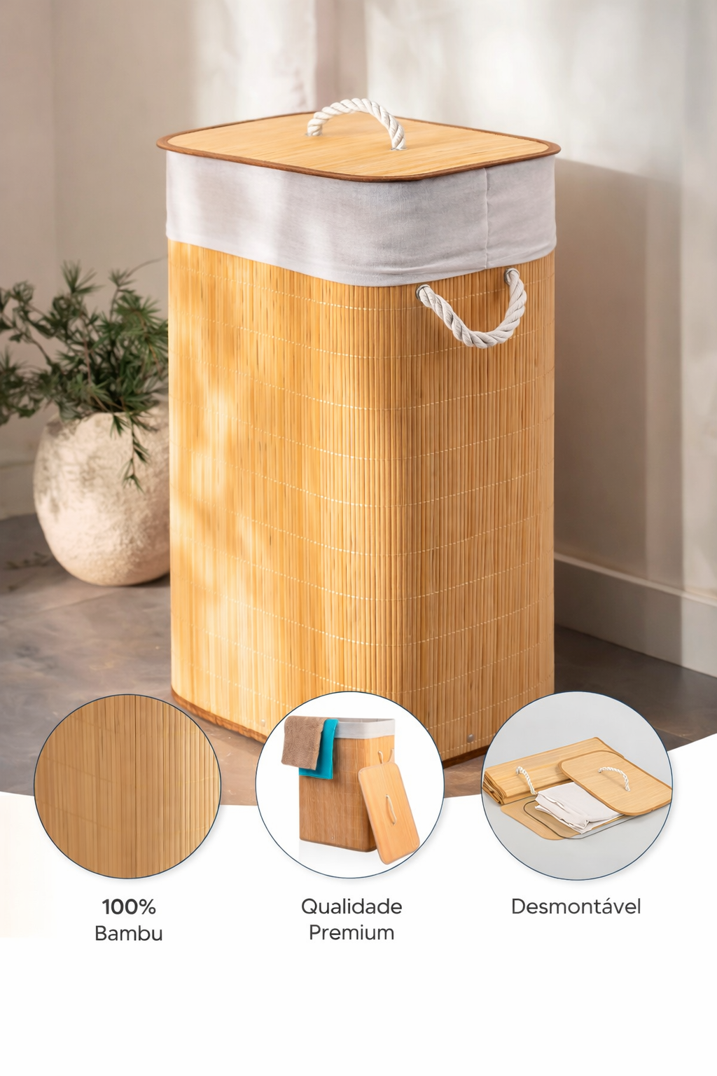 ✔ Coloque o cesto em um espaço desejado e insira o saco de tecido para um transporte mais prático da roupa suja
