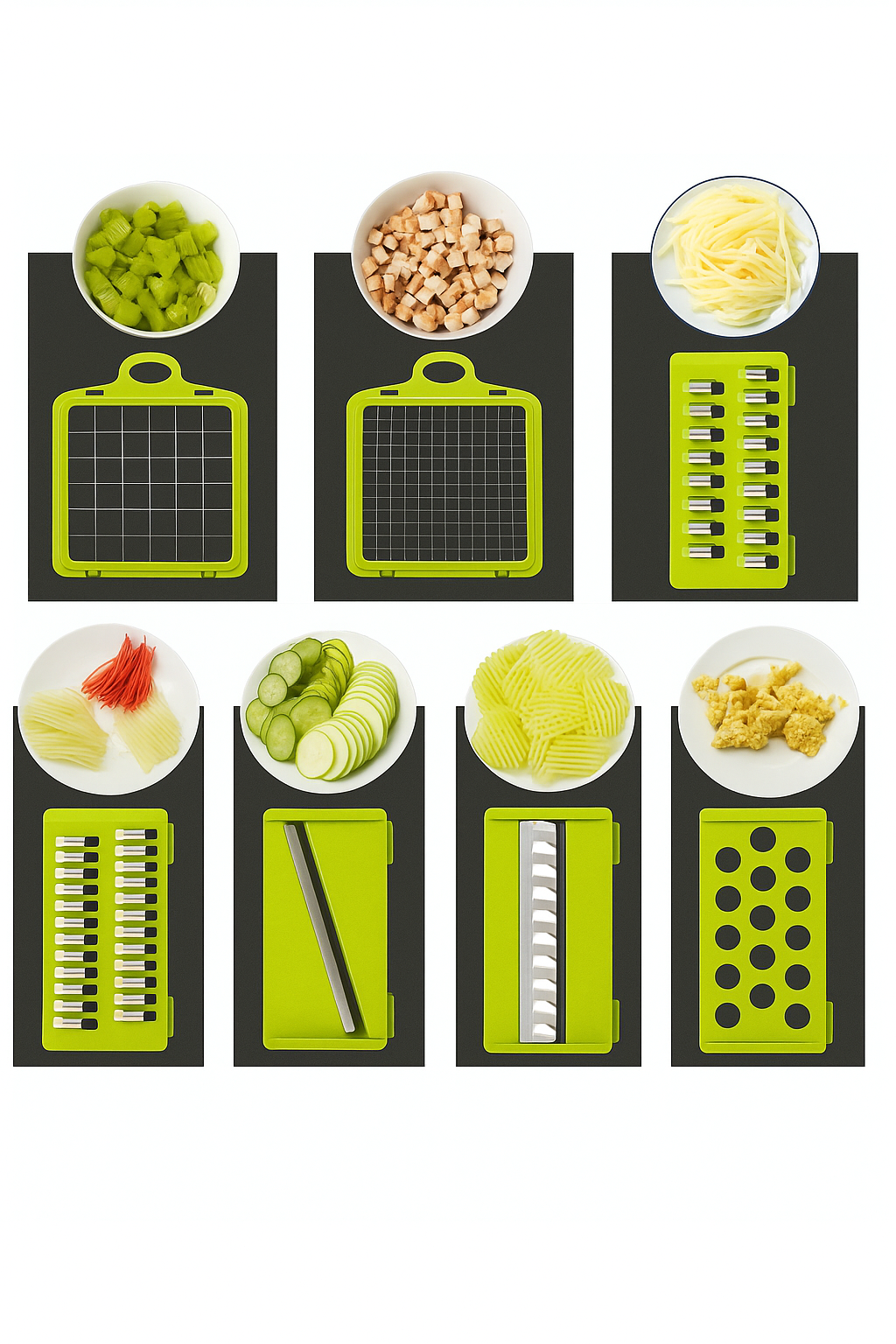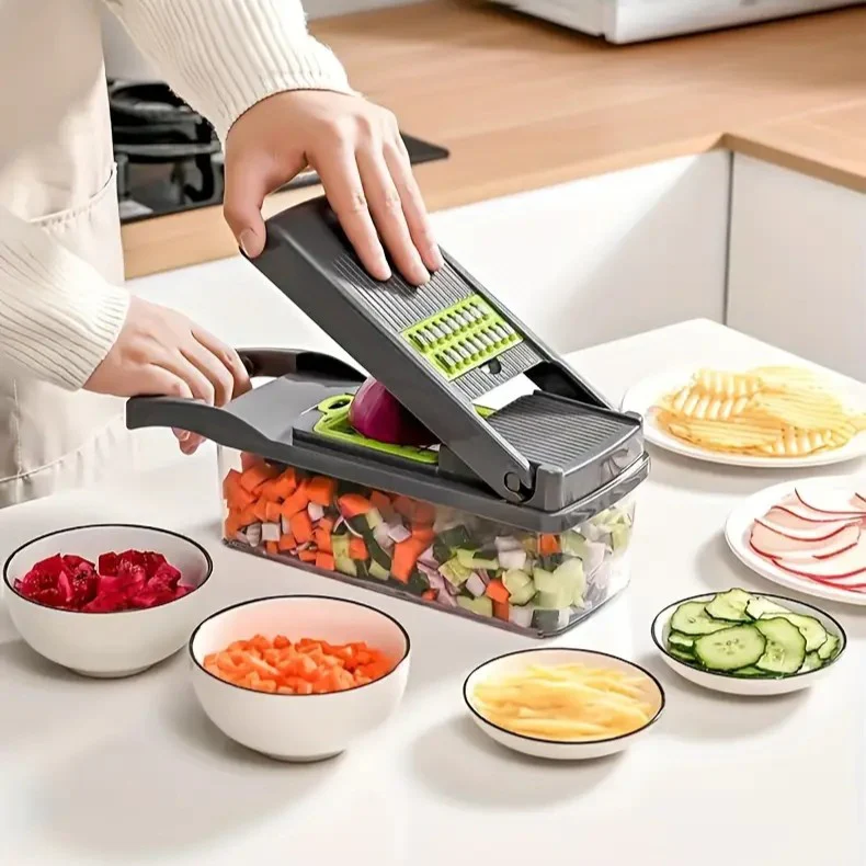 Você pode cortar em cubos, tiras, rodelas finas ou grossas, além de ralar e fatiar de várias formas. São 16 funções em um só produto.