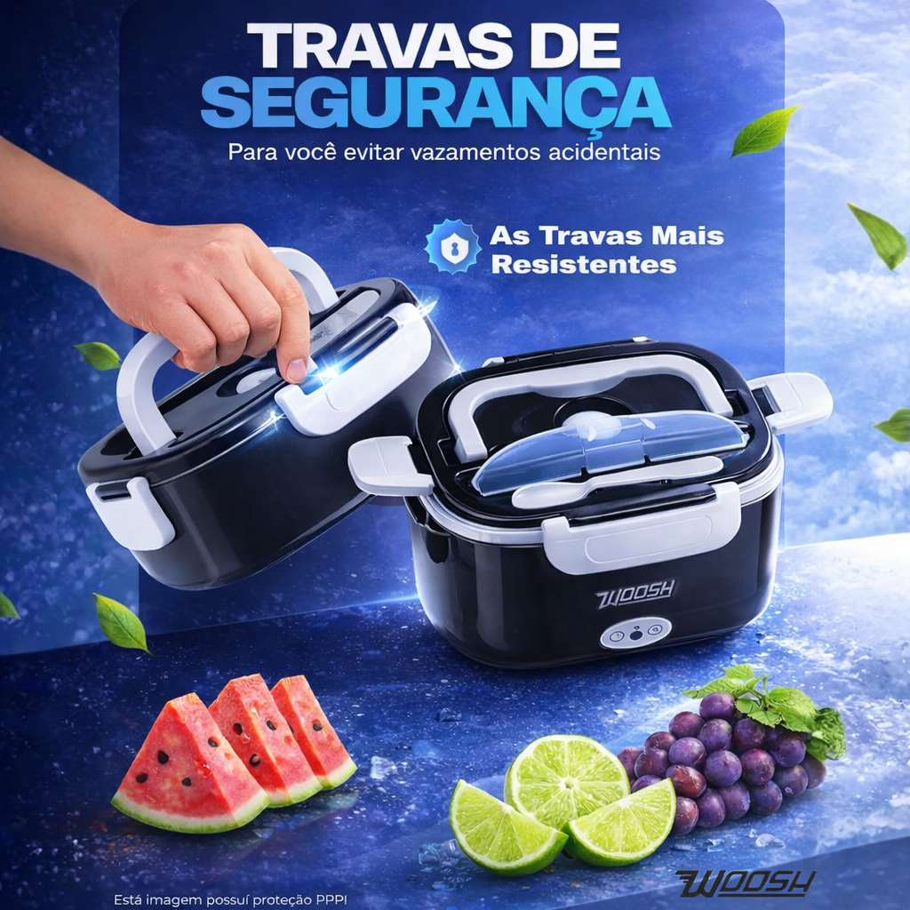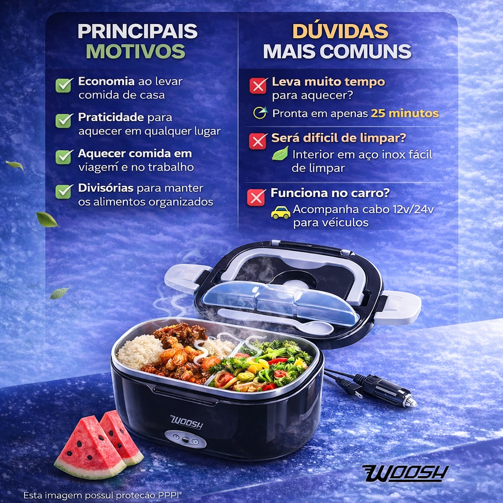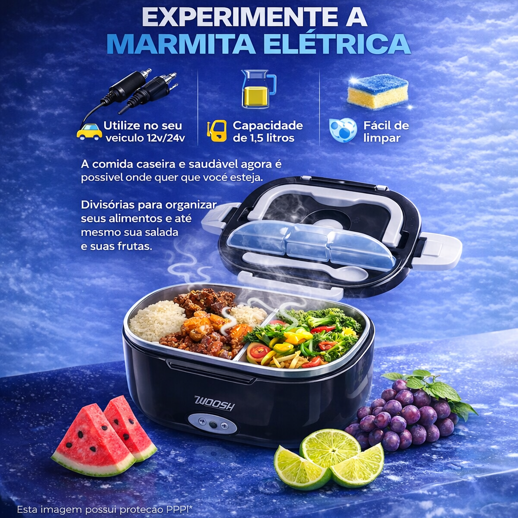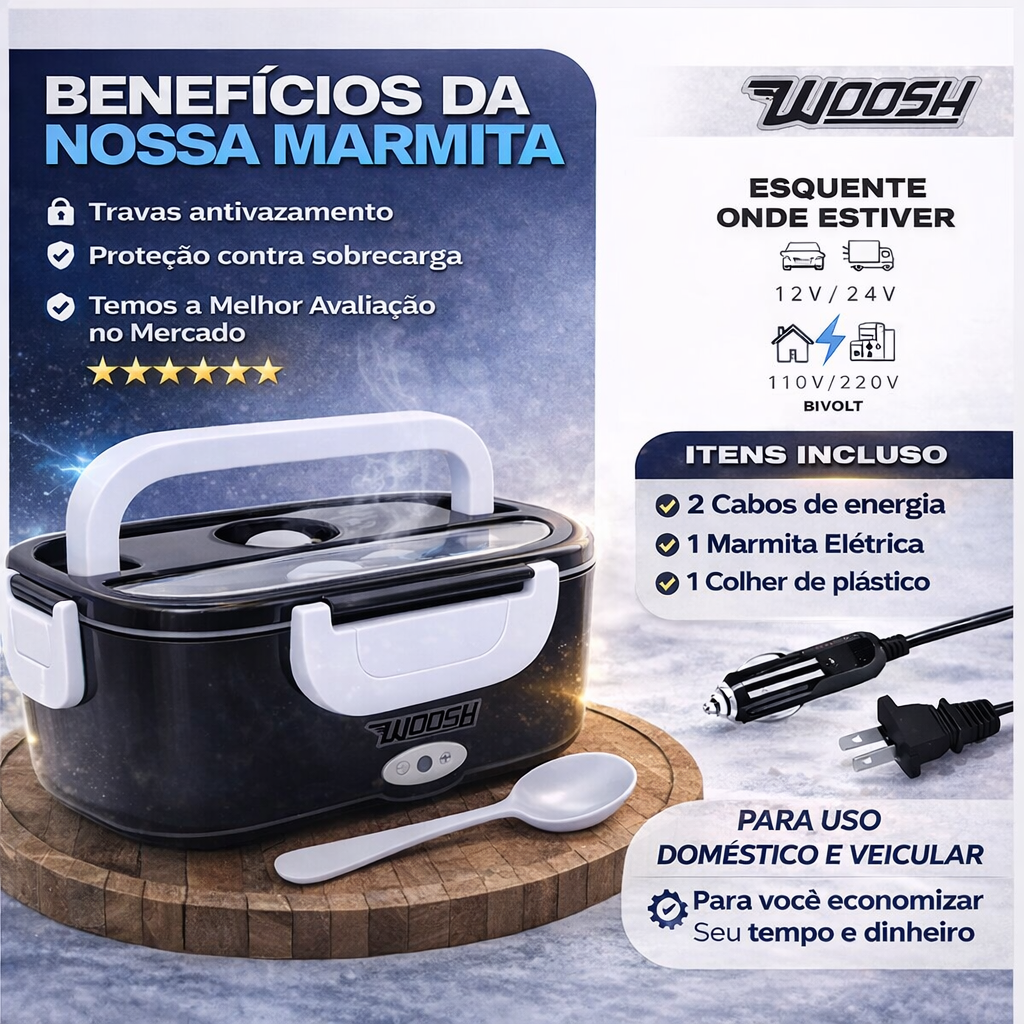 Leve praticidade, conforto e economia para o seu dia a dia com a Marmita Elétrica Portátil WOOSH. Ideal para quem trabalha fora, viaja com frequência ou passa muito tempo no trânsito, ela aquece sua comida de forma rápida e segura, sem precisar de micro-ondas.