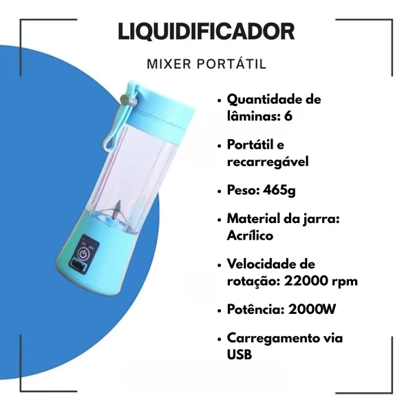 Prepare seus sucos, shakes e vitaminas fresquinhos onde quiser! Compacto, leve e recarregável via USB, o mini liquidificador portátil é perfeito para o dia a dia corrido, academia, viagens e trabalho.