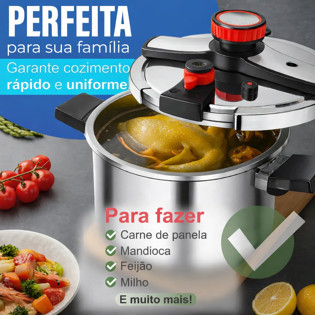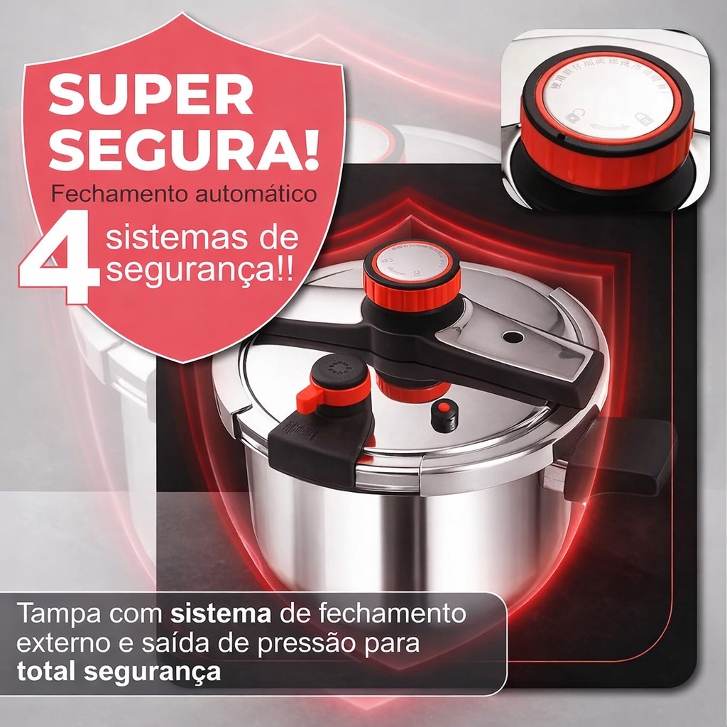A SafeCook Pro é a panela de pressão com sistema anti-explosão projetado para oferecer total controle no preparo dos alimentos. Equipada com 4 travas de segurança e travamento inteligente da tampa, ela reduz riscos e garante cozimento rápido, uniforme e confiável. Fabricada com material de alta resistência e durabilidade, proporciona mais tranquilidade na cozinha e desempenho superior no dia a dia.