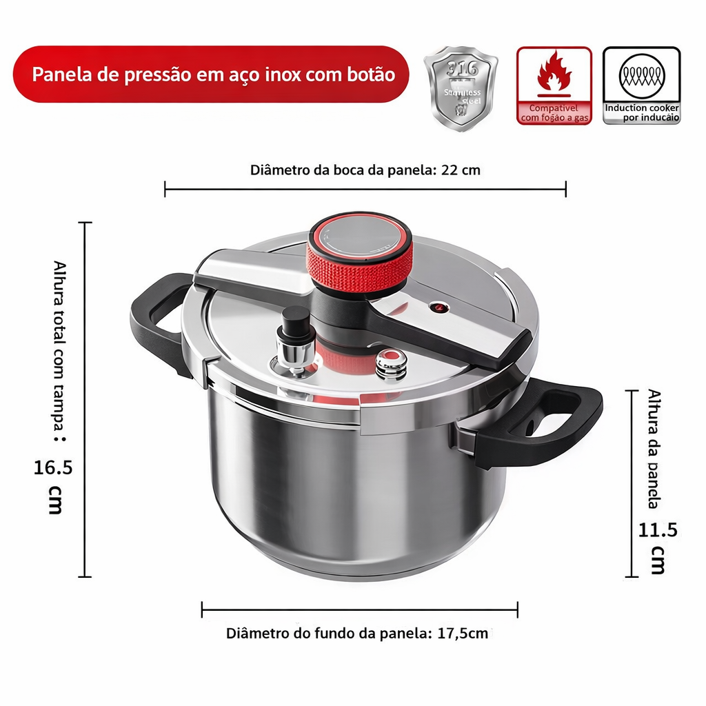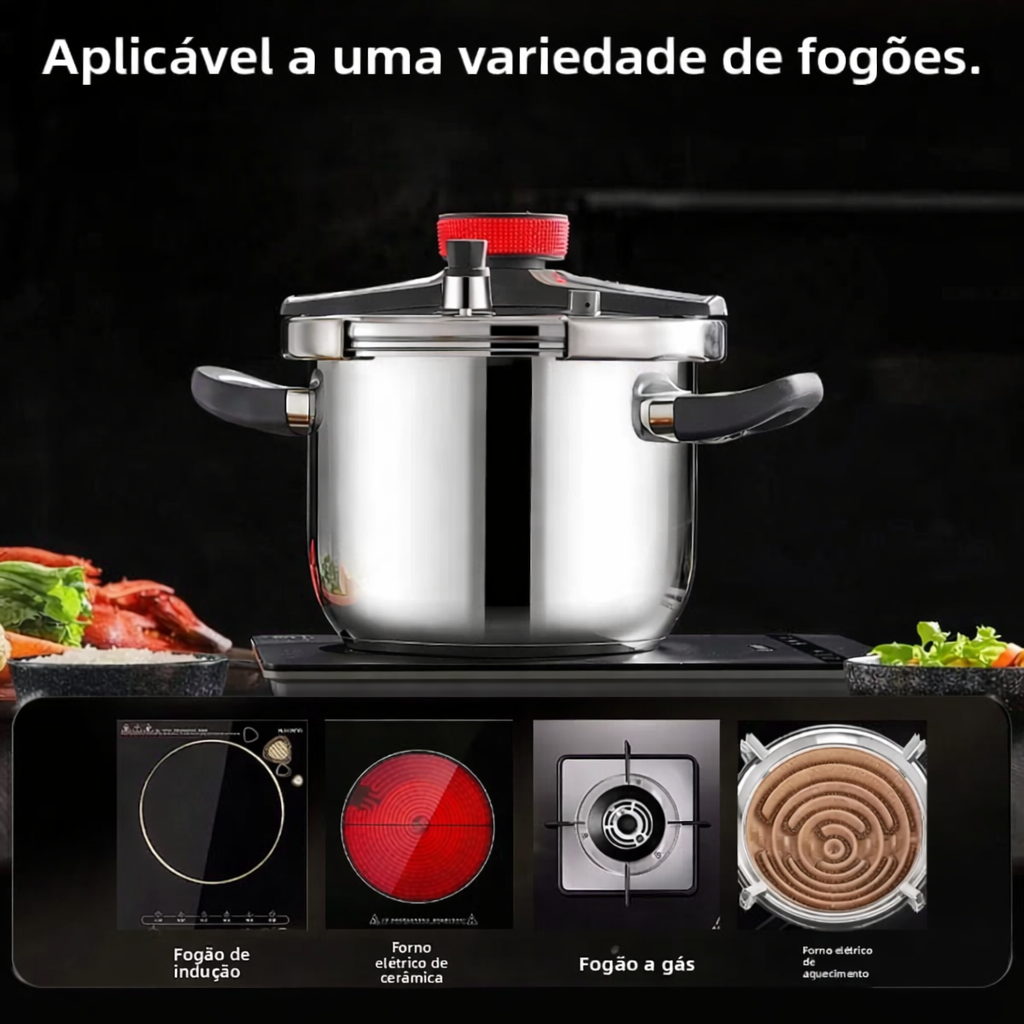 O sistema libera automaticamente o excesso de pressão caso ultrapasse o limite ideal. Além disso, a tampa possui encaixe com travamento mecânico que evita abertura acidental.