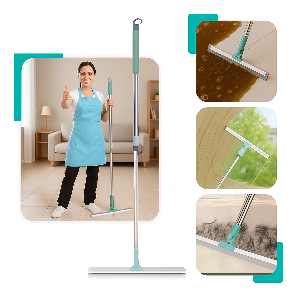Facilita remoção de água ou resíduos líquidos (lado “rodo”) e de poeira ou pelos (lado “vassoura”).