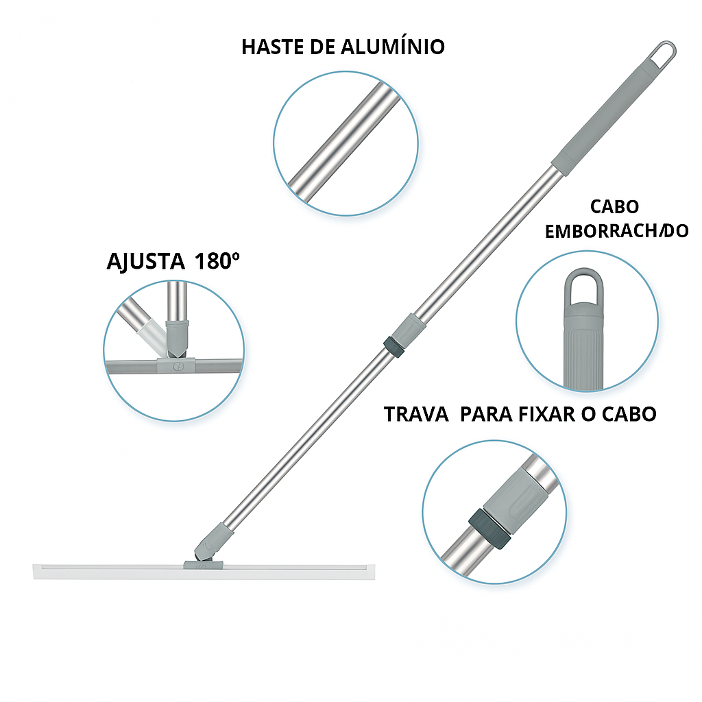 Com suas cerdas de silicone flexíveis, ele remove poeira, cabelos e líquidos com facilidade, sem riscar o piso e sem acumular sujeira. Já a lâmina de silicone macia garante vidros e superfícies brilhando, sem marcas ou manchas.