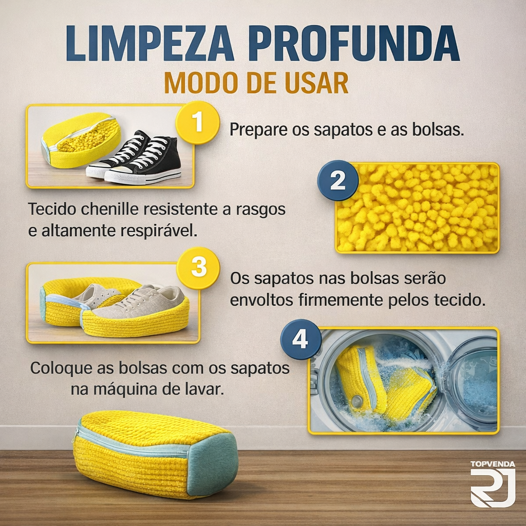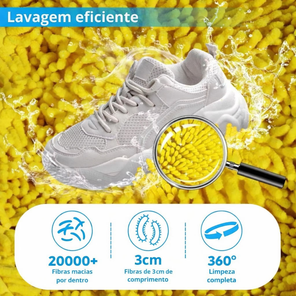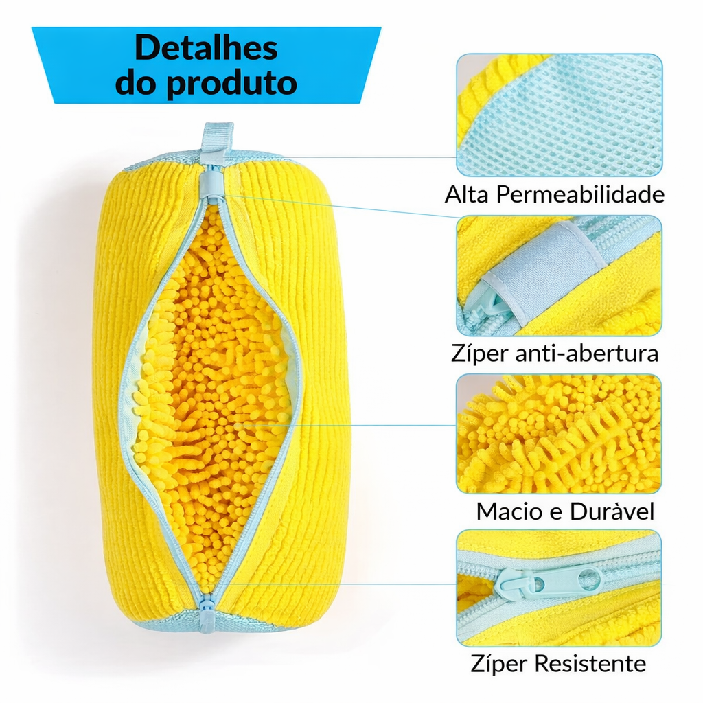 Seu design interno com fibras especiais remove sujeiras com eficiência, enquanto o zíper reforçado mantém os tênis firmes durante todo o ciclo de lavagem. Ideal para tênis esportivos, casuais e até sapatos delicados.