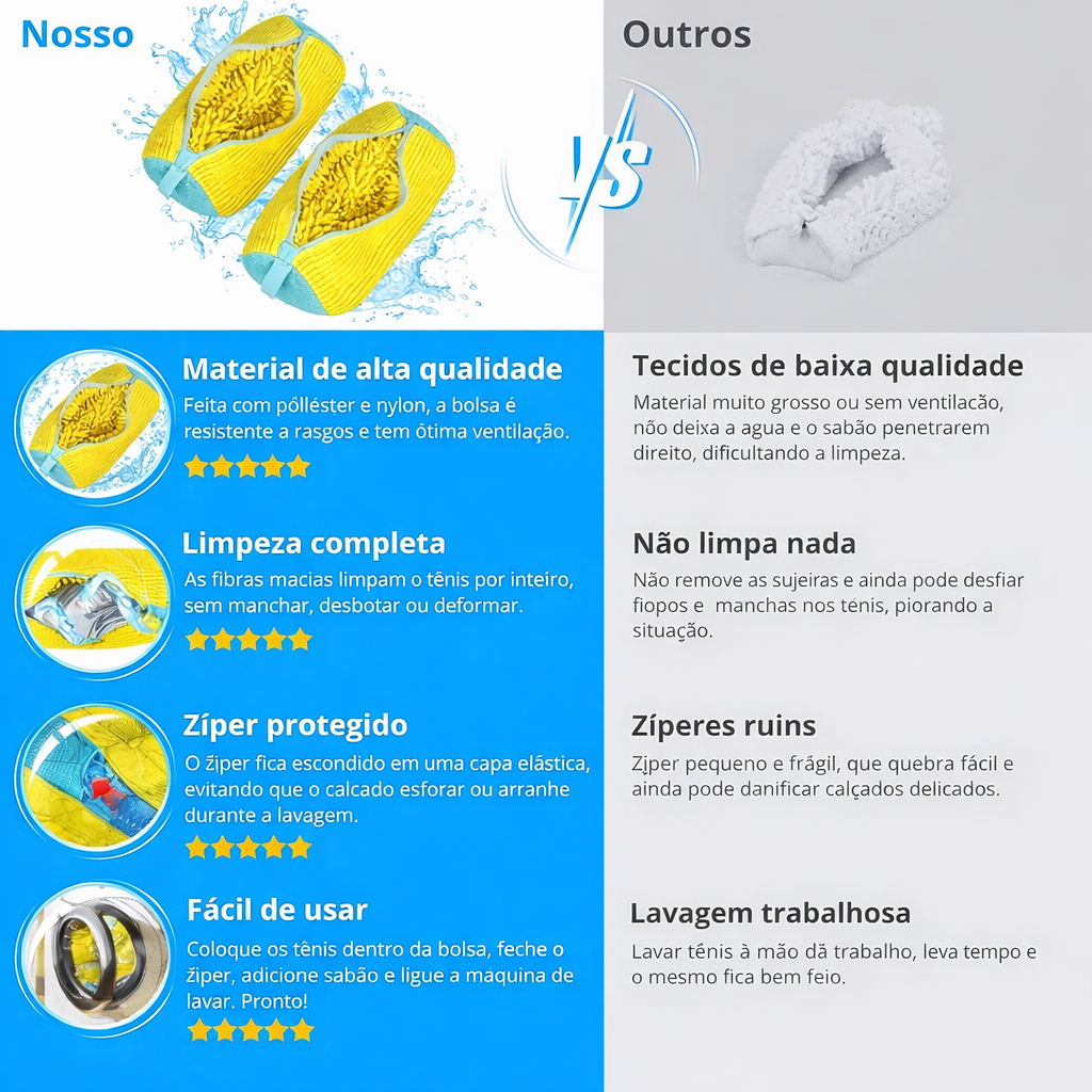 Lave seus tênis na máquina sem medo de estragar! O Saco de Lavagem para Tênis foi desenvolvido com material macio e resistente que protege o calçado, a máquina e suas roupas, garantindo uma limpeza profunda e segura.