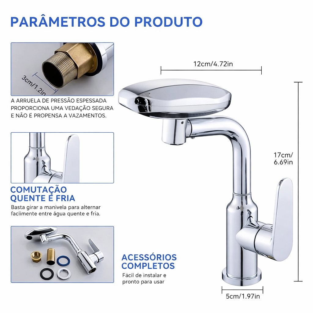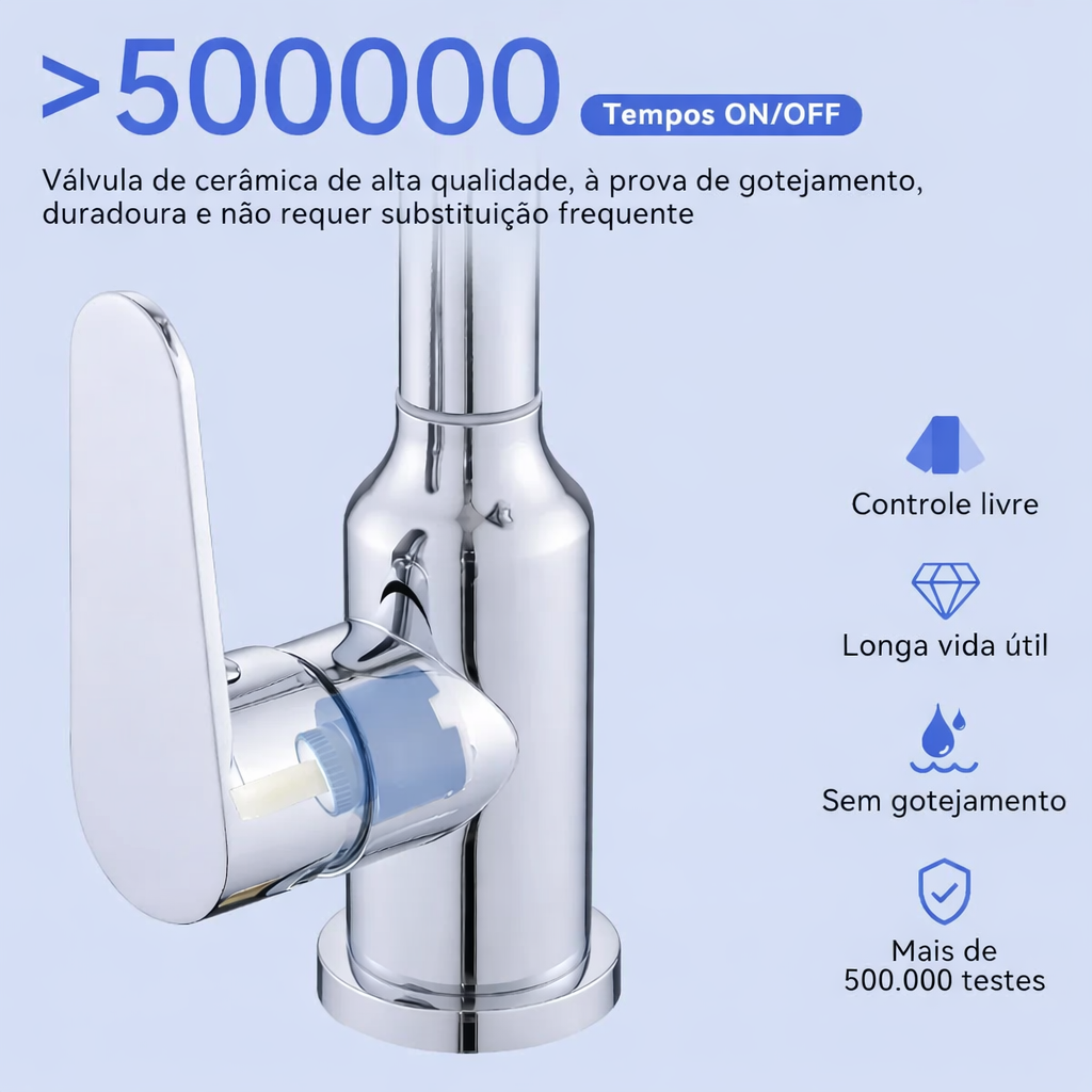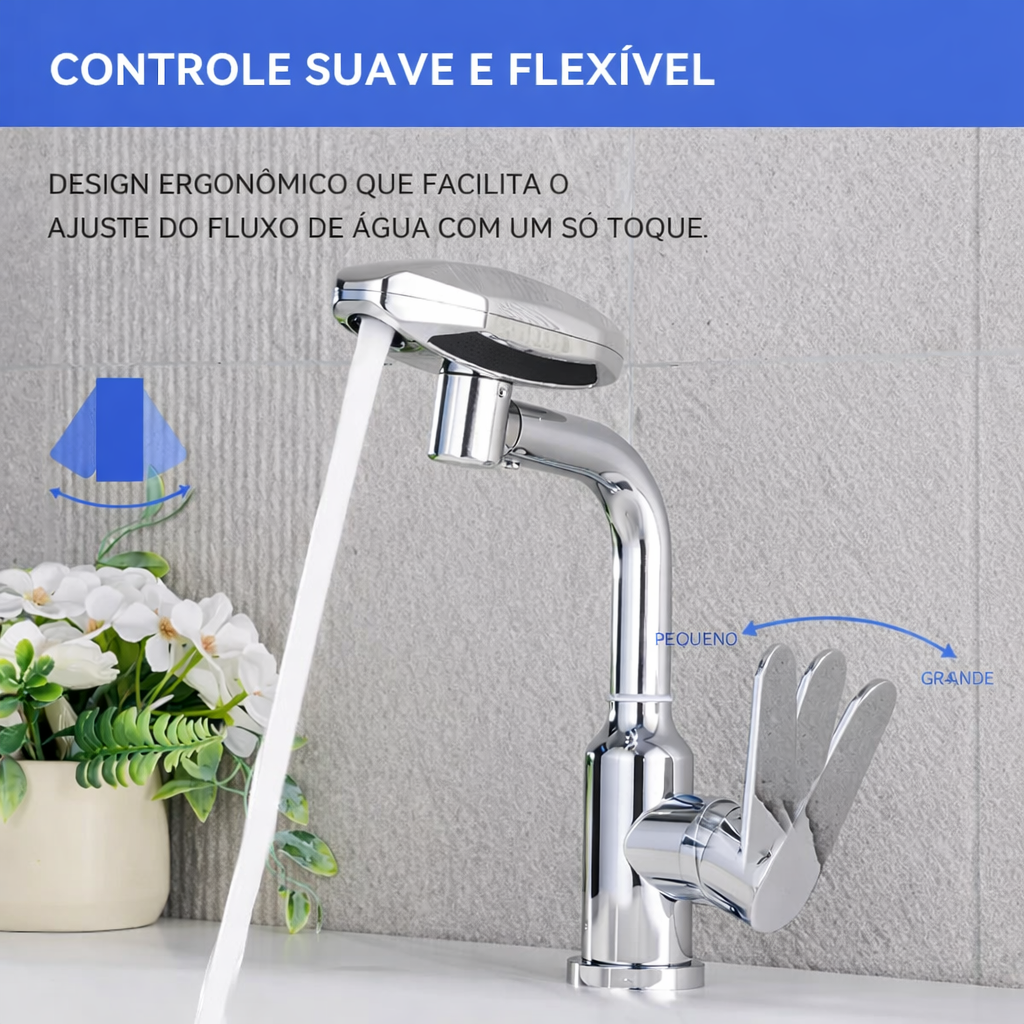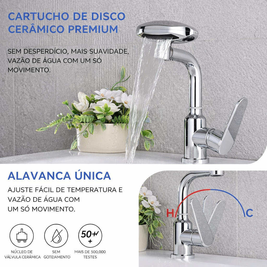 A torneira monocomando permite controlar água quente e fria com apenas uma alavanca, ajustando temperatura e pressão com precisão. O sistema 360° permite giro total do bico, oferecendo mais mobilidade e praticidade no uso diário.